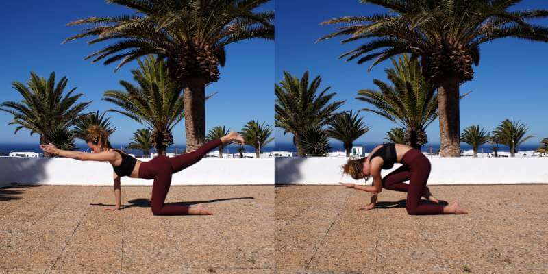 Kneel on all fours. Reach one arm long, draw in the abs, and extend the opposite leg long behind you. Bring the elbow and knee in towards your center as you round your back. Each side 5-10 repetitions.