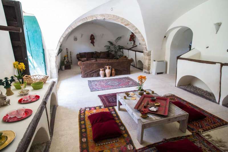 Our group will be accommodated exclusively in the main house and the cottages of the Masseria in 13 double rooms. Every room is equipped with double beds, whichcan be separated or joined together, depending on the needs. Two of the rooms (around 20sq.m each) with private bathroom, are located in the main building, above the Yoga room. A third room with private bathroom is in a cottage in the garden, with its own private patio. The other 10 double rooms, with shared bathroom – one every two rooms – are located in five cottages (around 50 sq.m each) in the garden, all with their own equipped private patio and their own kitchenette. All rooms have heating and air conditioning facilities and are elegantly furnished with antique or Sicilian style furniture.